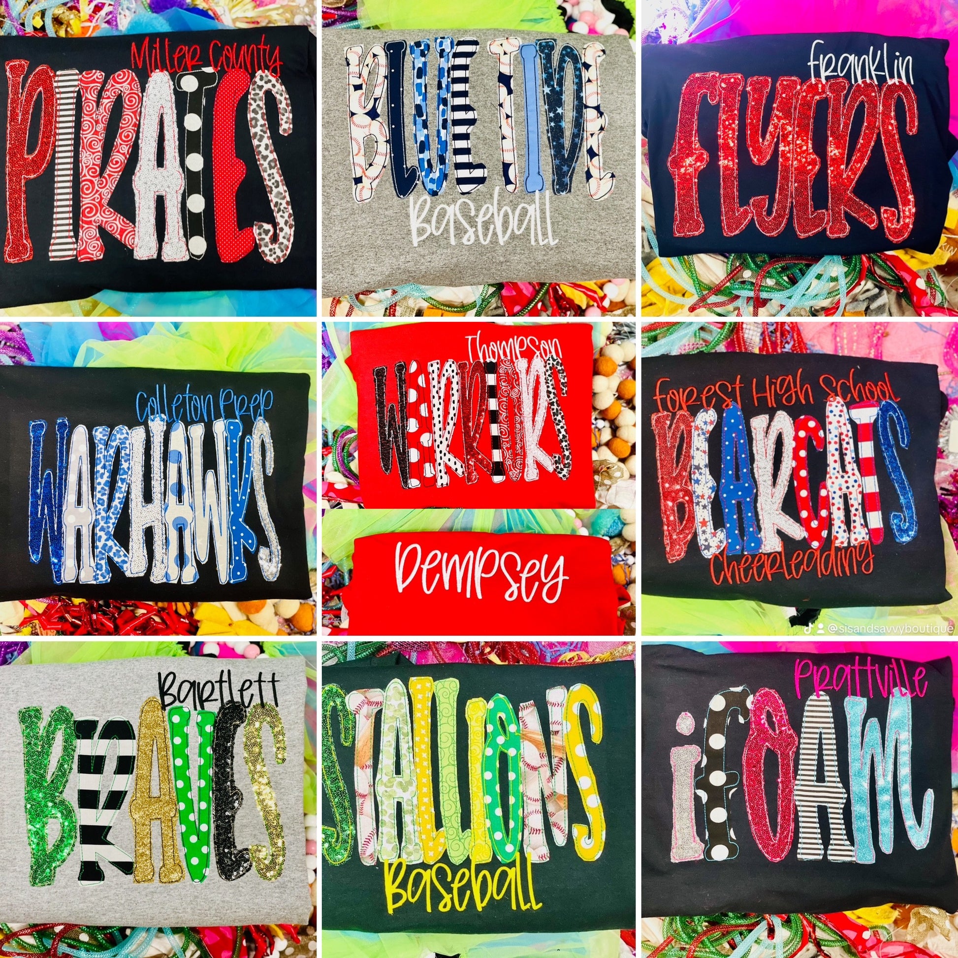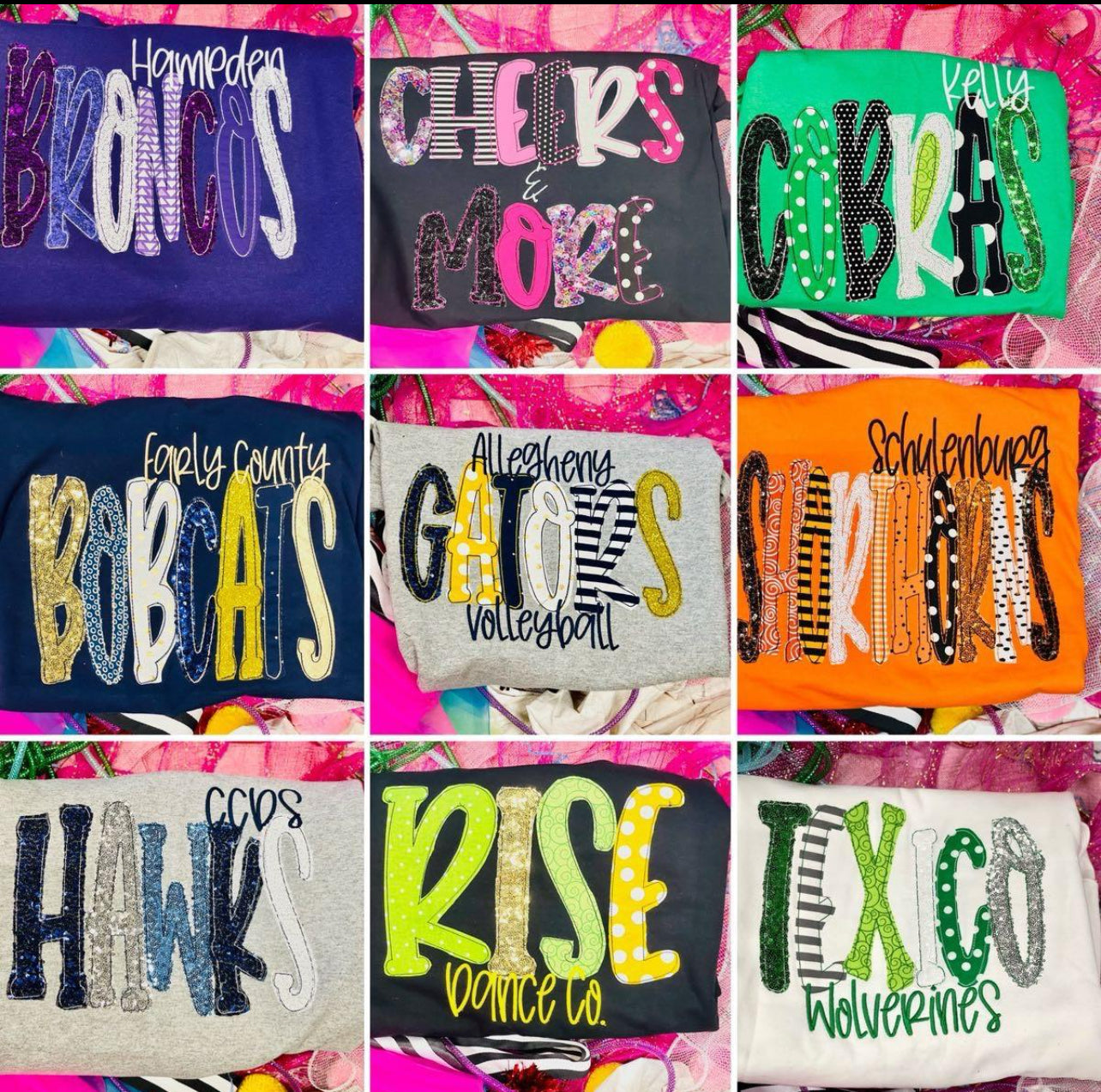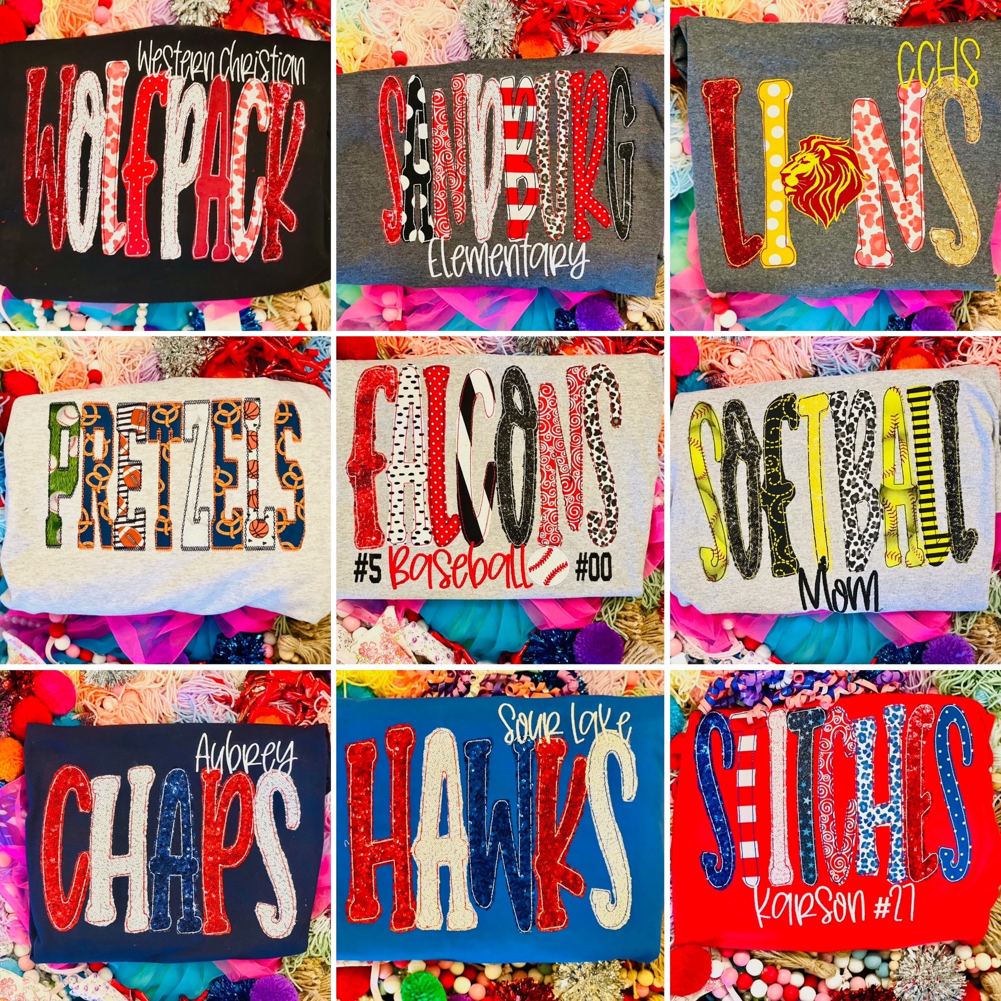 We have done HUNDREDS of these and we would love to customize one for your team or school! You can check out our other listings for examples! We have hundreds of fabrics! Adult Shirts are Gildan, Jerzees, etc. (depending on availability The design is embroidered, meaning it is stitched into the shirt for great quality and durability. If you have any questions please let me know! Machine Wash COLD, INSIDE OUT & HANG DRY, do not put in the dryer. To Personalize: Add a note when purchasing- your team name, colors, and if you would like a t-shirt, sweatshirt, or long sleeve tee. Price is the same for any shirt choice. Colors may vary slightly due to the screen resolution.